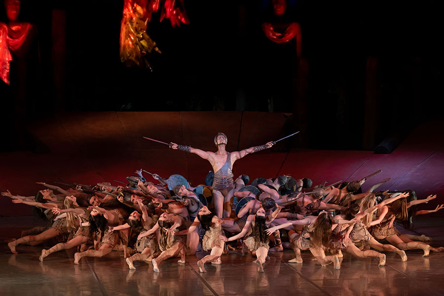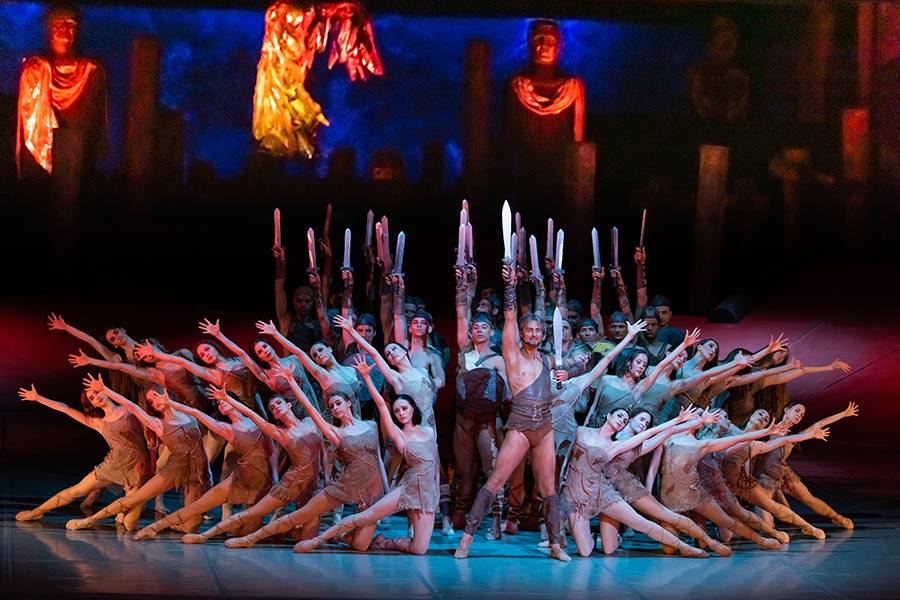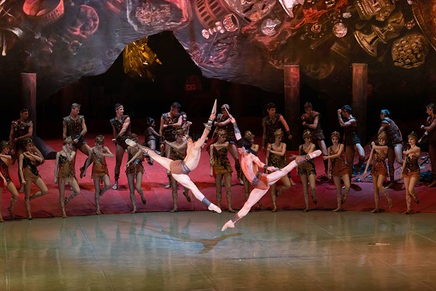 Асноўным драматургічным прынцыпам балета стаў кантраст, супрацьстаянне дзвюх сіл – паўстаўшых гладыятараў і перанасычанага Рыма з яго магутнай ваеннай машынай. Палярныя цэнтральныя вобразы – высакароднага, маральна бездакорнага Спартака і разбэшчанага юрліўца Краса. Дэманструючы, як рымскія легіянеры, выцягнуўшы наперад руку ў прывітанні, якое стала шырока вядомым у нашым стагоддзі, крочаць як бы па эпохах і кантынентам, аўтары зноў, як і ў папярэдніх балетах, перакідалі масты з мінулага ў сучаснасць. Не толькі чKрвонай арэнай цырка, але і крывавай арэнай гісторыі ўспрымалася сцэнічная пляцоўка, створаная мастаком. Арыгінальнымі былі танец рук, які ўвабраў у сябе малення, скаргі і плач запалоненых рабоў; эпізод доўгага і цяжкага, сапраўды «хрэснага» шляху паўстаўшых гладыятараў, і асабліва сцэна смерці Спартака.