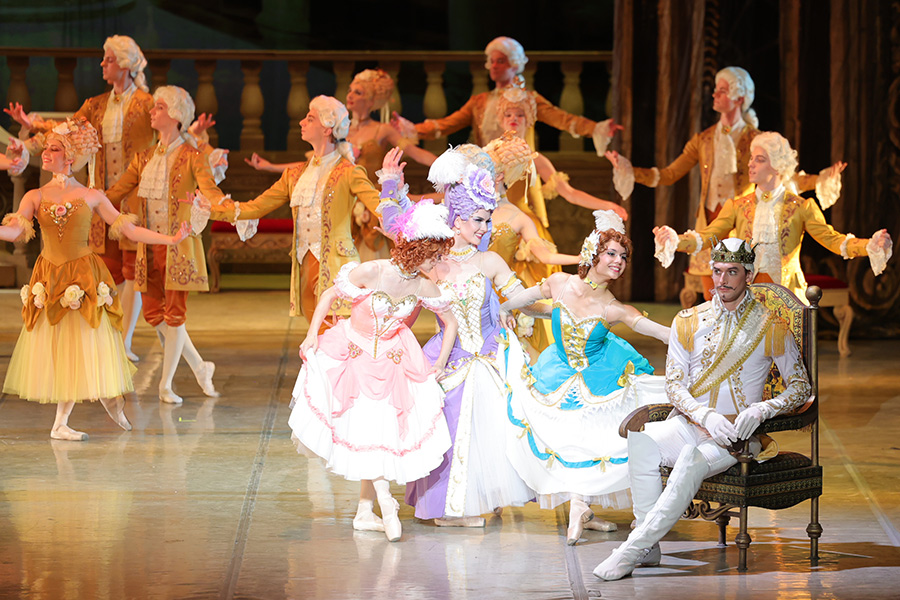 There is a fuss in the palace. The Master of Ceremonies hurries his assistants.! Ceremonial music plays, the King and guests enter the hall. Among the guests are the Stepmother and her daughters. They try to attract the King's attention, but the King is clearly unimpressed by their "talents." The announcement of the Prince's arrival, saves the King from annoying guests.