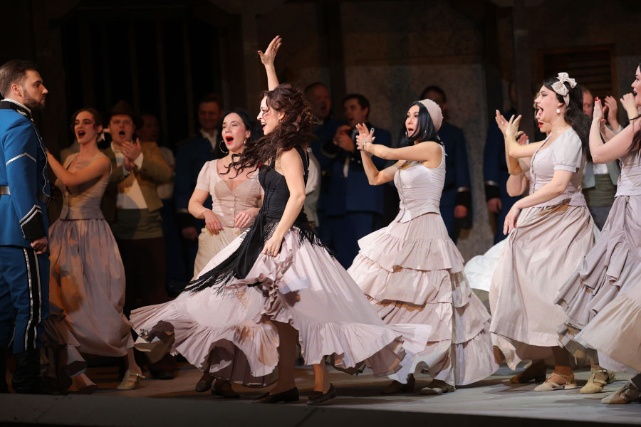 After the changing of the guard Lieutenant Zuniga asks José, who has come with the relief guard, whether the factory female workers are young and beautiful. Meanwhile, the menfolk gather: the girls will soon have a break. Everyone rapturously welcomes the feistiest and prettiest girl, Carmen. Exasperated by José’s inattention to her, she uses all her charm to attract his interest and finally succeeds. As she runs away, she teasingly throws a flower of acacia at José.