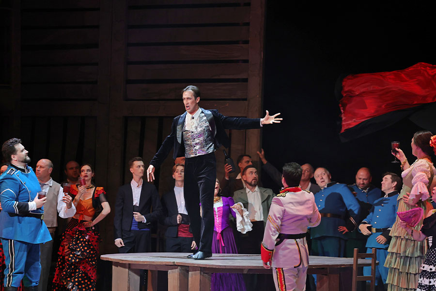 Accompanied by his friends and numerous admirers, the famous toreador Escamillo enters the tavern: the officers have invited the valiant torero to celebrate his beautiful victory. Escamillo immediately sets his sight on the proud and pert Carmen, but she is unwilling to fall into the toreador’s arms. While leaving, Escamillo promises that one day he will win the favour of the obstinate Carmen. The tavern visitors follow him.