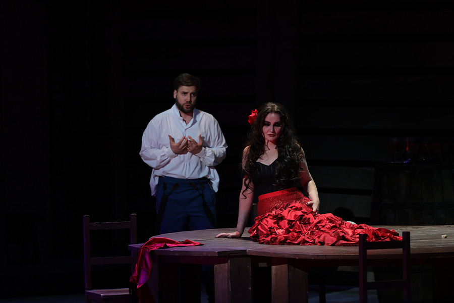 Anticipating his rendezvous with Carmen, José enters the tavern. Carmen is overjoyed to see him: she dances and sings for him alone with tenderness and passion which has never been shown to anyone. The long-awaited meeting is interrupted by the sound of bugles: José has to return to the barracks. Carmen is outraged: how can he leave such a woman like her? José is in despair. Neither his sincere acknowledgement of love, nor his entreaties, nor his pleas can mollify Carmen. The wilful gypsy drives José off: if he really loved her, he would leave everything and flee with her and her friends to the mountains where freedom awaited them.